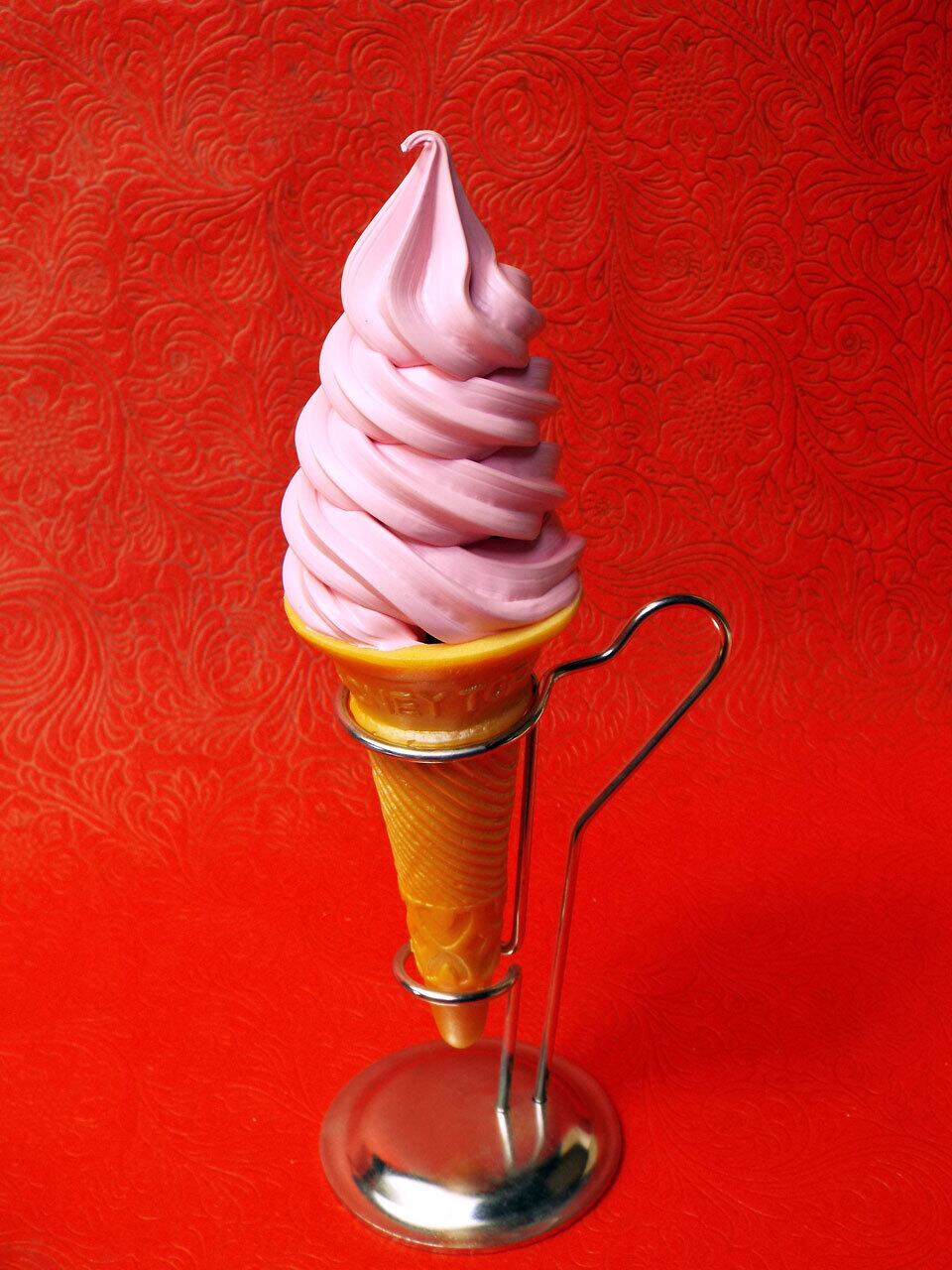 夏の暑さにも負けず、ソフトクリームに触っても溶けなくて、グルグルうずまきのソフトクリームを手にした瞬間の『わくわく』する気持ちも、長~い期間その姿を留めていられるのも食品サンプルの長所です。