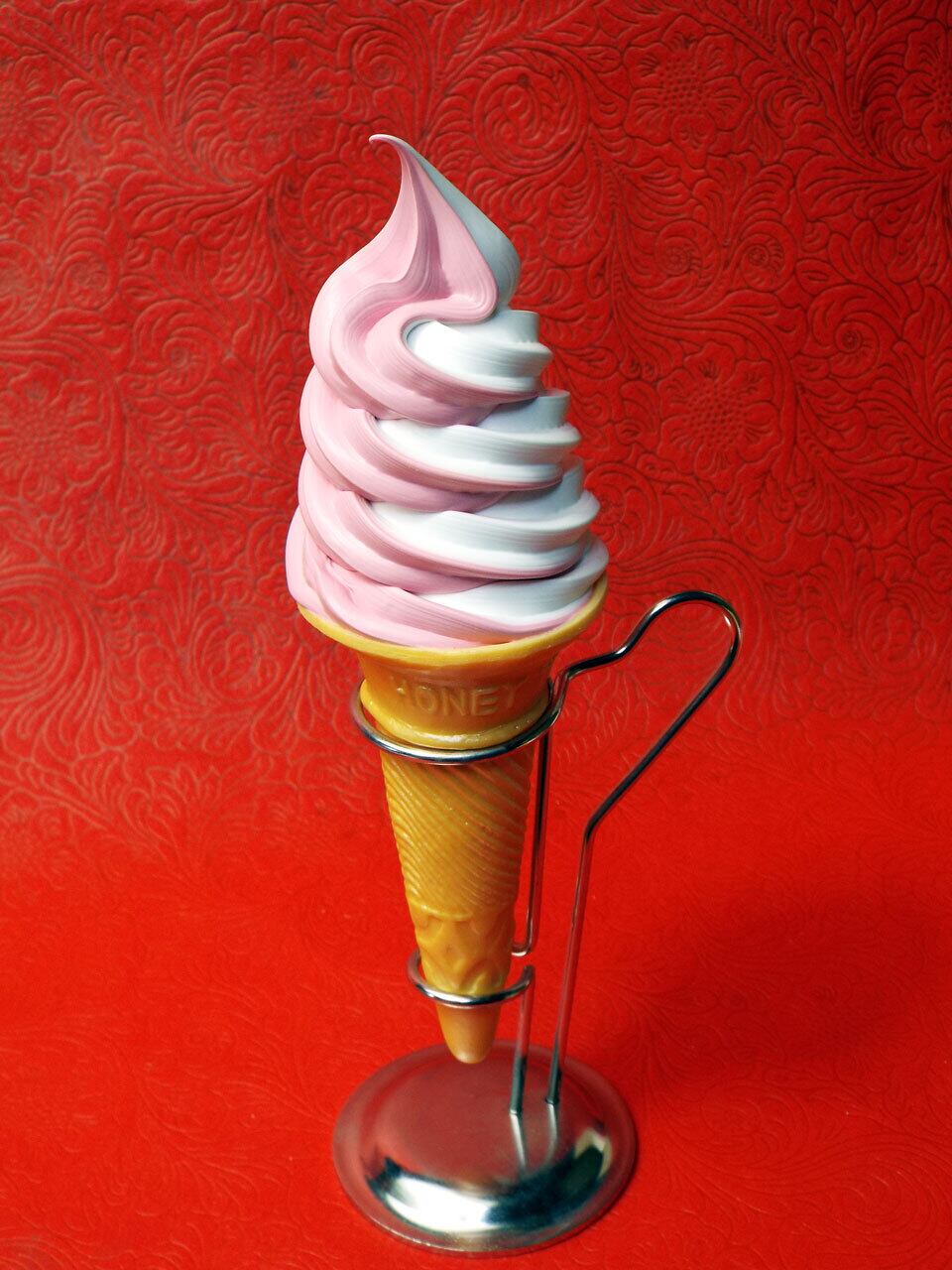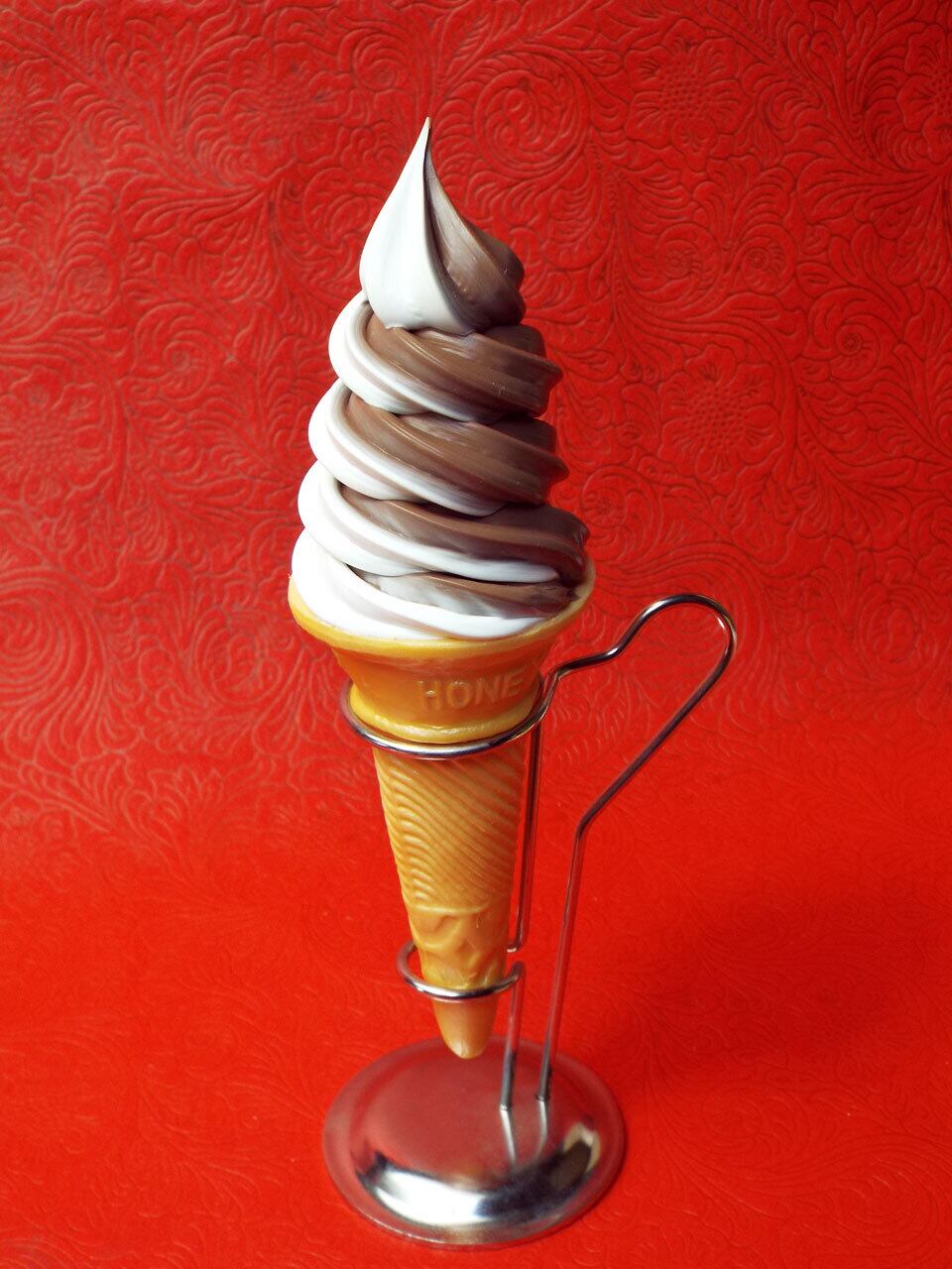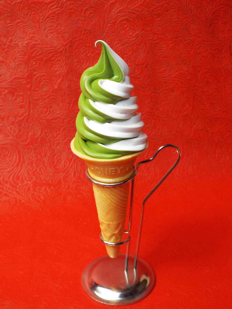 夏の暑さにも負けず、ソフトクリームに触っても溶けなくて、ぐるぐると二色のうずを巻いているソフトクリームを手にした瞬間の『わくわく』する気持ちも、長~い期間その姿を留めていられるのも食品サンプルの長所です。